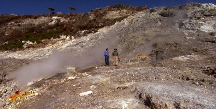 The Phlagrean Fields/Solfatara: "I think the Solfatara volcano is great—smoking, steaming, and smelly. The smell is from the hydrogen sulfide which comes out of the fumaroles at around 320 degrees Fahrenheit (160 degrees Celsius) and smells like rotten eggs. These were called the Forum Vulcani by the Romans, which means 'Home of the God of Fire.' The idea of harnessing the fumaroles and directing that hot gas/air mixture to heat a bath astonishes me. It really does imply a practical, almost comfortable relationship with volcanoes...not what I would expect in a place so close to Vesuvius."