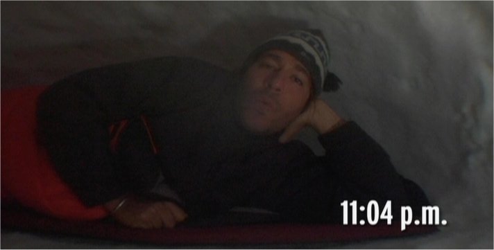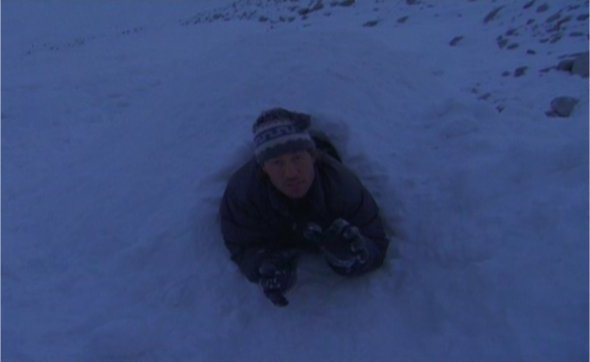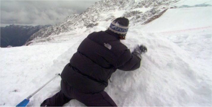 Quinzhee: "'Quinzhee' is an Inuit word for snow shelter. It's like an igloo, only the structure is made from compressed snow instead of ice blocks. I've spent many a night in a quinzhee in the Rockies and am happy to give it a go on a glacier in the Alps. (How could I say no?)