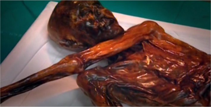 Oetzi's Body: "Isn't that mummy weird? It's like shriveled meat with freezer burn... Seeing it for the first time, I'm impressed by how much data has come from this one body. They say he had arthritis and that the tattoos he had on his body (59 tattoos!) were possibly the earliest form of acupuncture. If you look carefully at the video footage, you can see the lines where he or someone he knew punctured his skin with pigments. If this was some sort of acupuncture technique, it would predate the Far East's claim as the birthplace of acupuncture by 2000 years!"