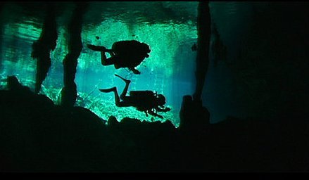 The Halocline: "Cenote diving is amazing, but passing through the halocline is even more amazing. Looking at the halocline, it appears like a shimmering wall of water, only you're already IN the water. It reminds me of the scene in The Abyss, when Ed Harris' character is looking at those aliens. Sort of a 'whoa, what's this?' feeling, and then you swim through it! Going through it is no big deal—it's just water. Although Pablo told me there are other cenotes where you can swim through layers of Hydrogen Sulfide and come out a bit tarnished (Hydrogen Sulfide makes silver turn black). In any case, I really enjoyed this part of the journey. I doubt a Maya person could have made the dive this deep, but I suppose it's possible..."