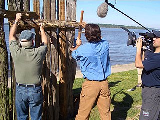Pain, Pain and More Pain: "Normally, when one is climbing a tree using boot spikes, it takes about 5 minutes. Because of the needs of filming, Dennis and I are up there for about 30. We both agree that this is perhaps the most painful thing we've ever done--the sheer agony in our shins has us both shaking in pain and self-control. Agh!! But the act of climbing up the tree "telephone-pole style" is pretty cool and the core sample is a great way to learn about the past. Turns out the colonists picked the WRONG year to come over--the driest winter in the past 800 years. Bad timing, huh?"