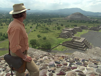 Pyramids: "There are many, many pyramids here at Teo. The two largest are called the Pyramid of the Sun and the Pyramid of the Moon. Unlike the pyramids of Egypt, these are not solid stone. Rather, they're a framework of stone and wood filled in with dirt and then covered with a stone façade. Back in the day, they had a layer of plaster on them which was beautifully painted and decorated. Today, though, they're still impressive and worth exploring. Linda Manzanilla is taking me deep under the Pyramid of the Sun, where a narrow shaft twists and turns downward, almost all the way to the center of the pyramid above. It's a long 300 feet and as we get deeper in, we need to be careful about losing the ability to breathe--the limited oxygen in here can only support our presence for an hour or so."